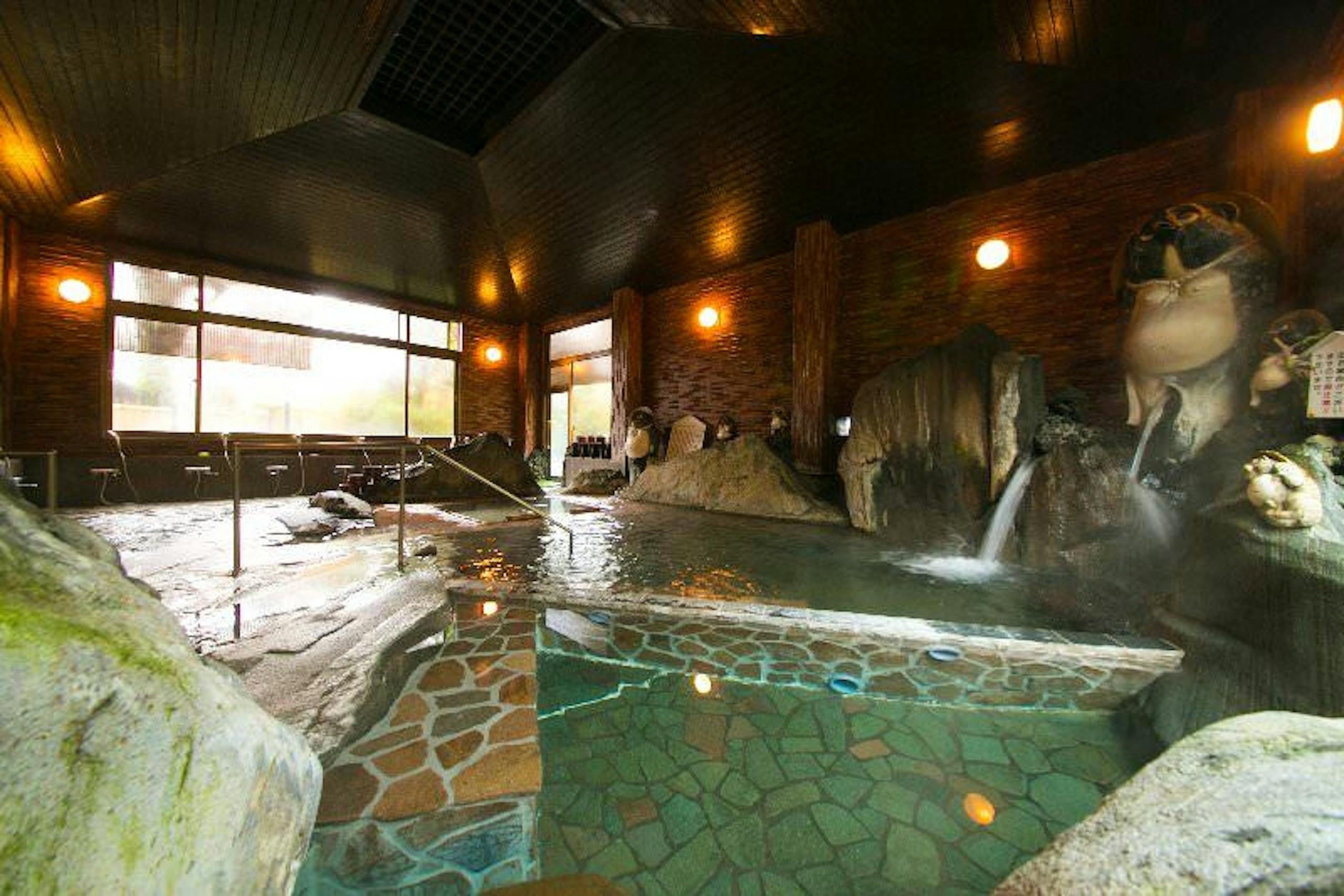 大きなたぬきがシンボルの「あつぎ飯山温泉 元湯旅館」です。
